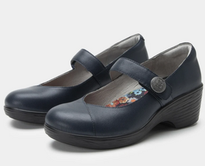 Mary Janes have matured in this grown-up leather version featuring a featherweight slip-resistant wood-look wedge bottom. Dressing it up is an adjustable hook-and-loop close strap with a decorative metal ornament. A printed microsuede-lined footbed made of polyurethane, cork, and memory foam completes the ladylike story.