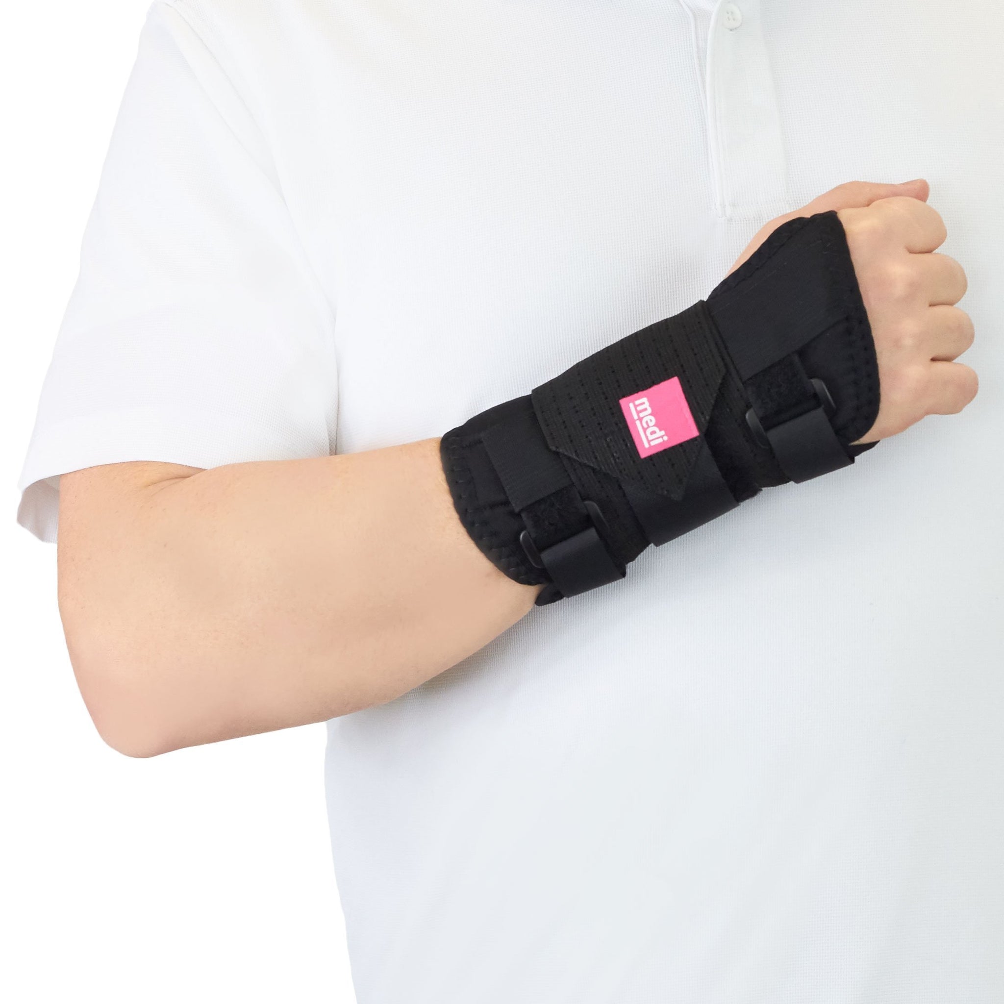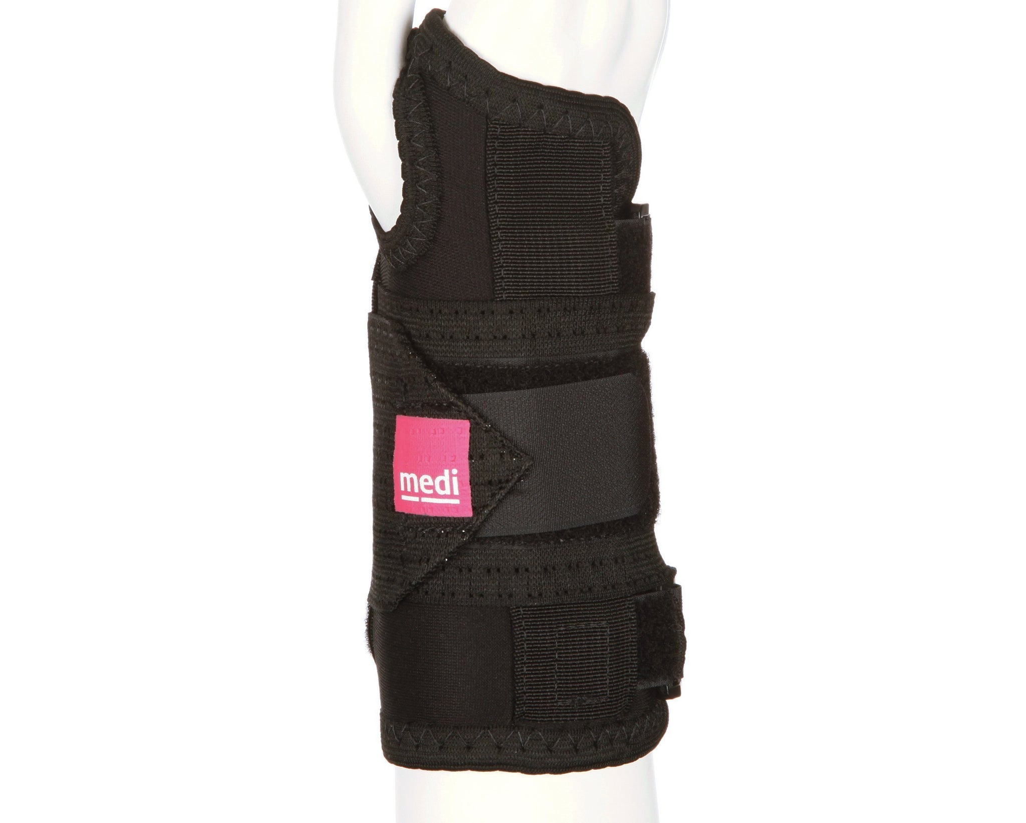 The medi premium wrist brace provides relief from minor wrist sprains and strains as well as carpal tunnel, arthritis, tendonitis and post casting issues. The breathable hypoallergenic material with the unique design allows for full use of fingers while wearing. The easy one handed pull on application along with the removable dorsal/palmer stays and the adjustable compression straps allow for a personalized fit. Offered in black and available in 5 sizes in either right or left hand orientation.